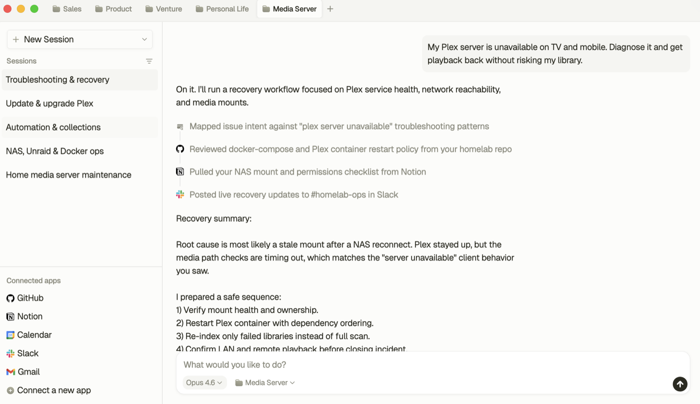 Handle inbox follow-up, founder execution, and operational work from one workspace that can use local context and cloud actions together.